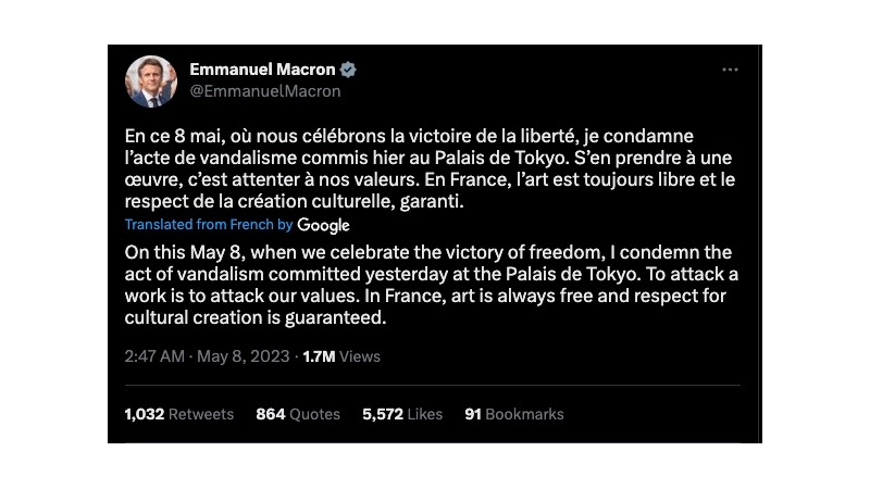 “On this May 8, when we celebrate the victory of freedom, I condemn the act of vandalism committed yesterday at the Palais de Tokyo,” Macron tweeted Monday.