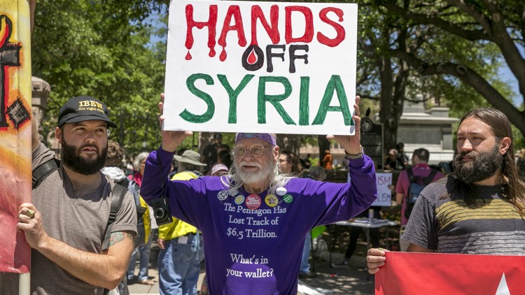 Demonstrations were held placards in support of peace and against America’s interventionist foreign policy.