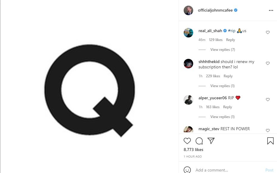 McAfee’s wife, Janice, is believed to have posted to his accounts for him while he was imprisoned – but it is unclear who posted the cryptic “Q” message.