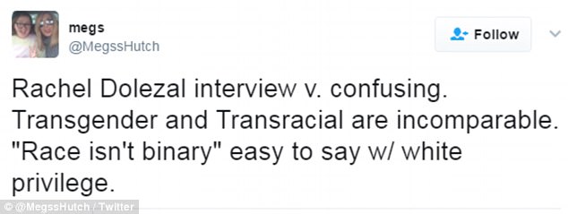 Following the interview, Twitter users criticized Dolezal’s comments, accusing her of using ‘white privilege’ to make her arguments.