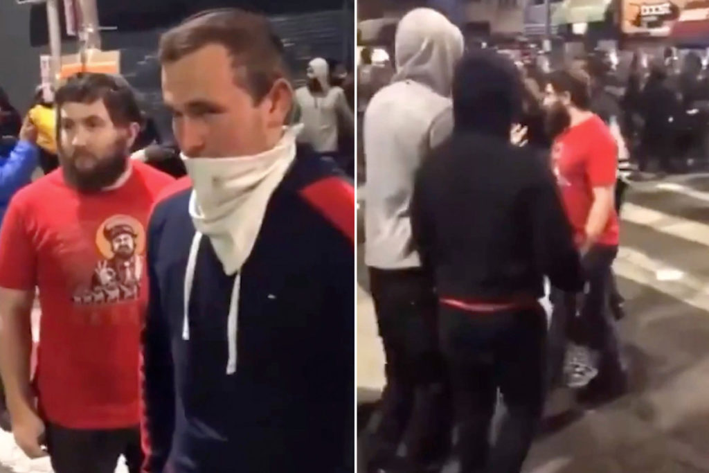 When the three men respond they live nearby and were out to ‘show solidarity’, another protester replies: ‘This ain’t your fight. Get the f*** out of here.’
