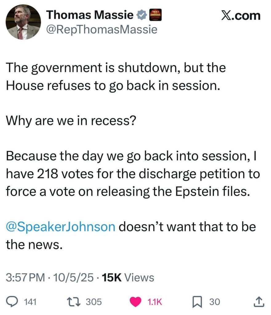 Massie’s publicly asked: “Why are we in recess? Because the day we go back in session, I have 218 votes.”