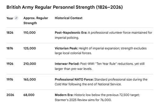 The British Army is currently at its smallest size in more than two centuries, and has fewer than 70,000 fully trained full-time servicemen ready for frontline deployment. The UK previously pledged to increase the force to 76,000 by 2029 but added only 240 soldiers over the past year