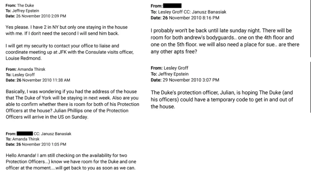 Andrew’s former private secretary, Amanda Thirsk, separately contacted Epstein’s executive assistant Lesley Groff to confirm space for both protection officers at the residence.
