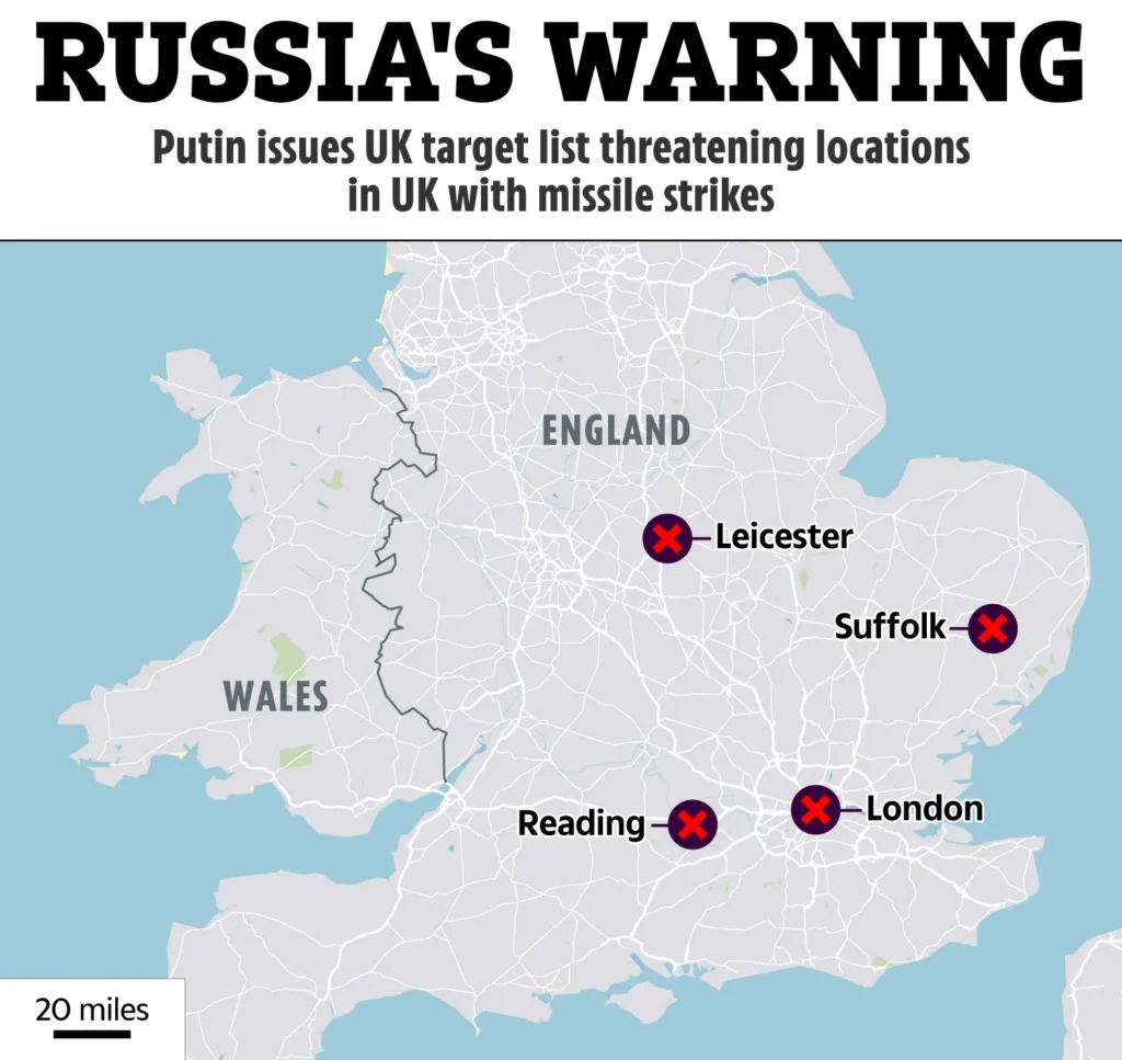 The threat was issued to four UK locations that Russia says have been aiding Ukraine and contributing to ‘dragging’ Europe into the conflict