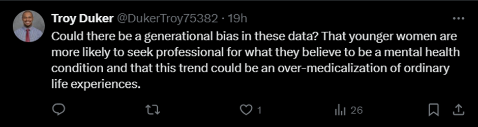 Wokespy.com reports: Results show that white liberal women aged 18-29 were the most likely to have been diagnosed with a mental health condition with 56.3% of respondents answering ‘yes’ in response to the question. This dropped to 27.3% when 18-29-year-old conservative women were questioned.