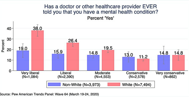 The same study the tweet above is quoting from also had the following statistics for ideology and mental illness not divided by race, and they show the same pattern: