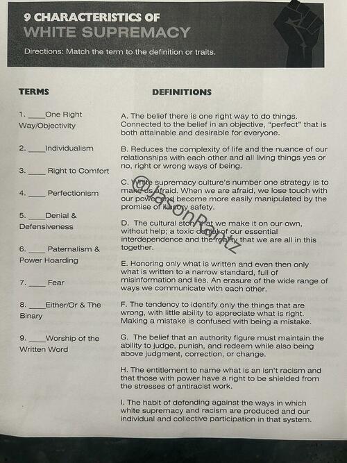 The worksheet labels “objectivity,” “individualism,” and “perfectionism” as white supremacy. If students deny their own racism — or that any of the nine characteristics are legitimately racist — is also white supremacy. Denialism or being overly defensive is a racist example of an “entitlement to name what is an [sic] isn’t racism and that those with power have a right to be shielded from the stresses of antiracist work.”