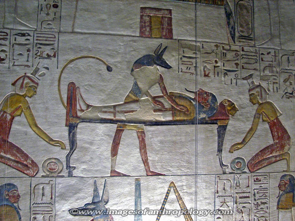 The tomb complex is huge and has multiple levels with chambers and shafts including a carving of Osiris and a room with a wall relief depicting a demon holding knives. It also has a massive hall supported by five pillars and a staircase leading down to the funerary complex which is where the carvings of Osiris is. The reliefs of the demon with knives were placed in the funerary room for protection of the deceased body.