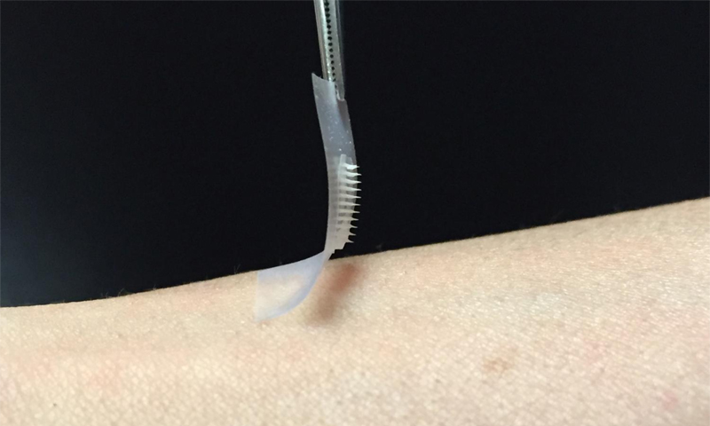 The patch – a thin square no bigger than a penny – is covered with more than one hundred tiny needles, each about the size of an eyelash.