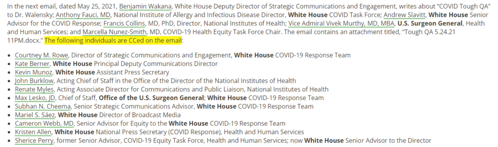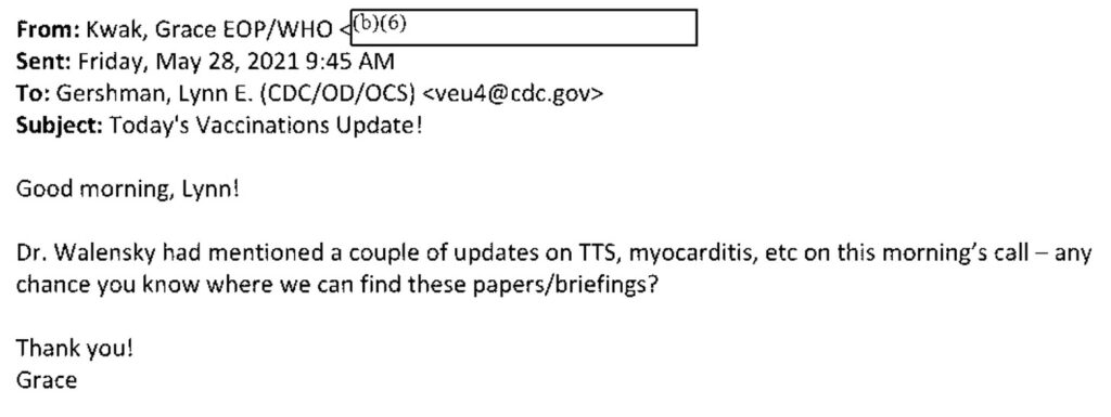 “The final email is from Grace Kwak, White House Advisor to the Deputy COVID-19 Response Coordinator, Executive Office of the President, asking Dr. Walensky’s Executive Assistant, Lynn Gershman, where to find ‘papers/briefings’ about ‘…updates on TTS [Thrombotic Thrombocytopenia Syndrome], myocarditis, etc.’ Ms. Gersham forward this ‘request from WH’ to Sherri Berger.”