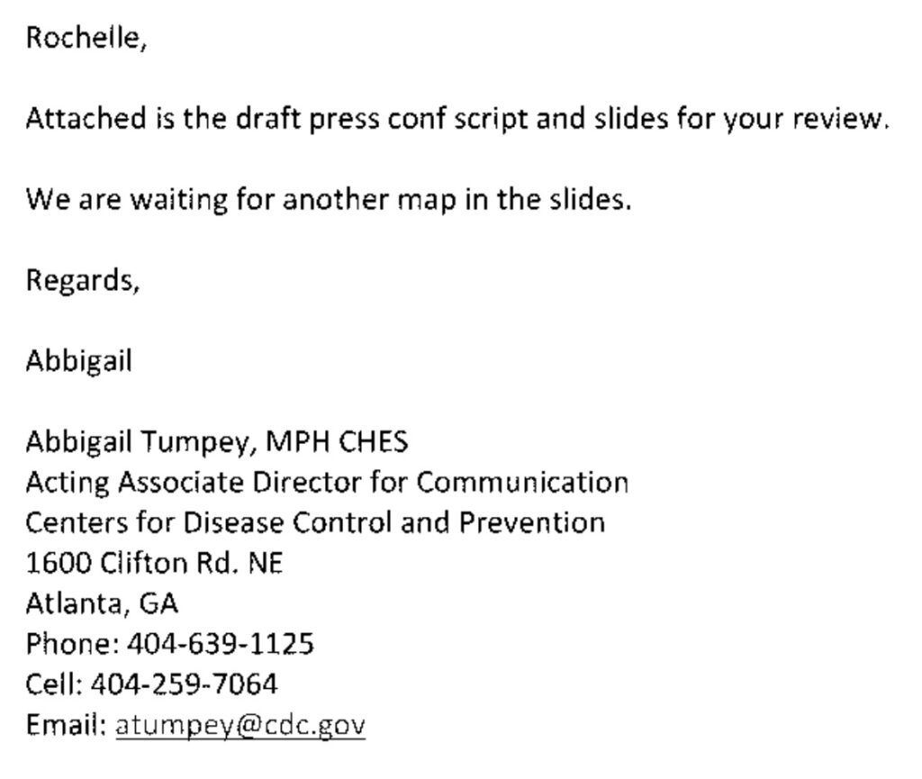 In the first set of emails, there’s an email thread from May 24-25, 2021, titled “Draft WH [White House] Script and Slides.” This email was sent by Abbigail Tumpey, a former key communicator at the CDC, to Rochelle Walensky, the CDC Director at the time, and several other high-ranking health officials. Attached to the email was a draft meant for a press conference, but the entire 10-page content is blacked out and can’t be seen.