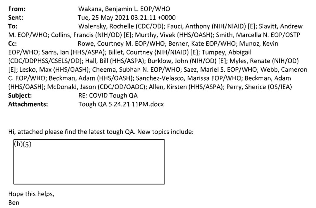 On May 25, 2021, Benjamin Wakana, a top White House communications official, sent an email titled “COVID Tough QA” to several key health figures, including Dr. Walensky, Dr. Fauci, Surgeon General Vivek Murthy, and several White House advisors. The email had an attachment named “Tough QA 5.24.21 11PM.docx.”