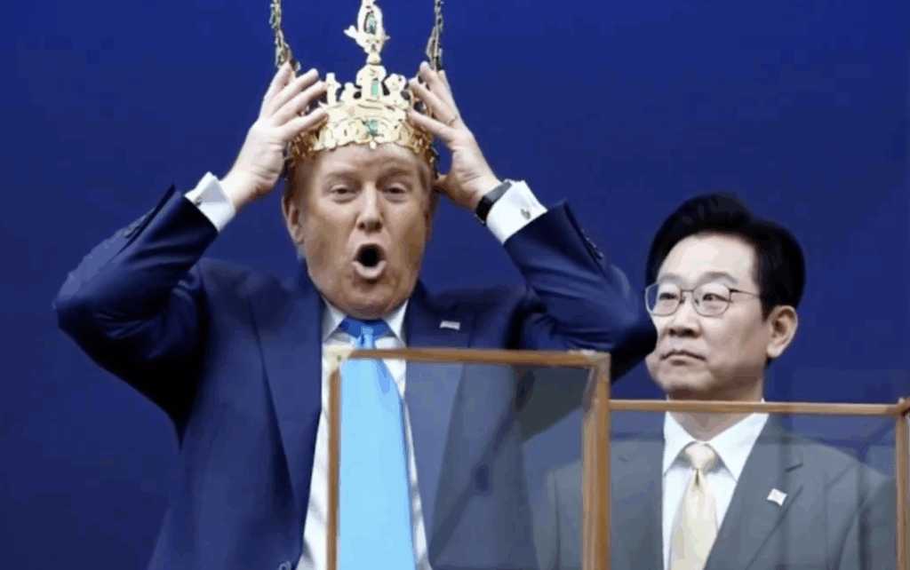 Just weeks after the “No Kings” protests swept through cities across the United States, South Korea’s president has handed him a literal crown.