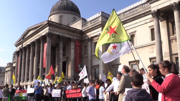 The activists, many of whom are Iraqi Kurds, accused the British government of supporting the Islamic State (IS, formerly ISIS) by providing training and arms to Syrian rebels, many of whom are affiliated with the terrorist group.