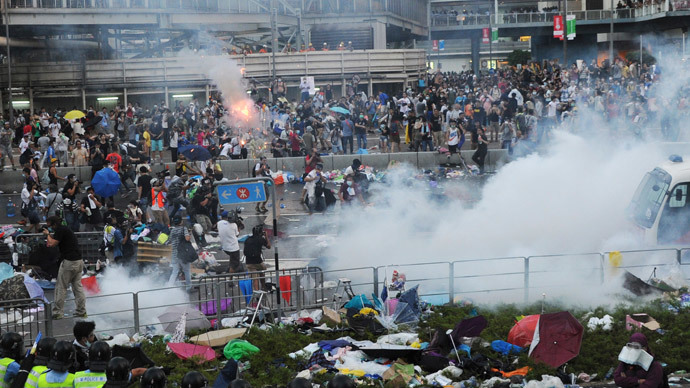 Local law enforcement had to use force to disperse protesters in the city’s Admiralty district near the main government offices, where they have been camping out throughout the weekend.