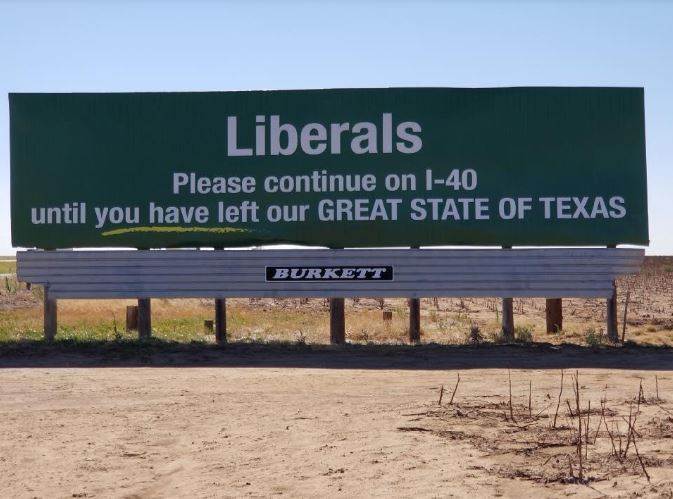 A billboard in the Texas panhandle has sparked uproar on social media because its message urged liberal motorists to keep driving until they had left the state.