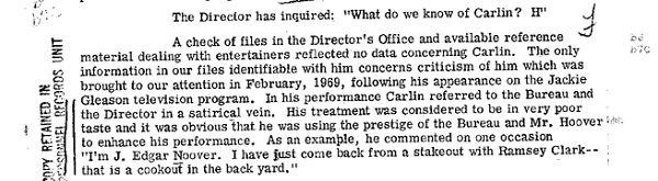 Just after his 1969 appearance on the Jackie Gleason show, Carlin caught the attention of the FBI because he made jokes about then-FBI chief J. Edgar Hoover. According to the government, Carlin had “referred to the Bureau and the Director in a satirical vein.”