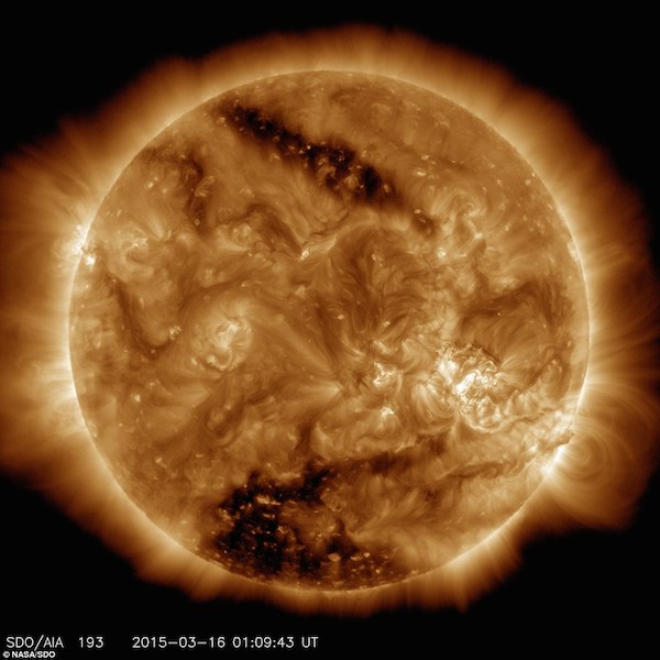 The incredible image was captured on Jan. 1, 2015 by the Atmospheric Imaging Assembly (AIA) instrument on NASA’s Solar Dynamics Observatory, shows the coronal hole as a dark region in the south.