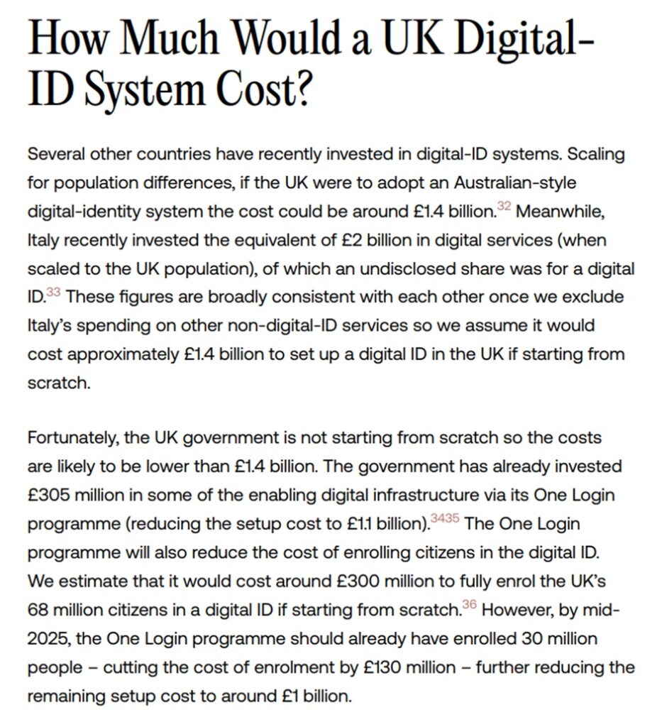 The total cost of a digital ID rollout in the UK, according to the analysis, would cost at most £1.4 billion, and a digital ID scheme could be developed and deployed “over the course of a single parliamentary term (five years).”