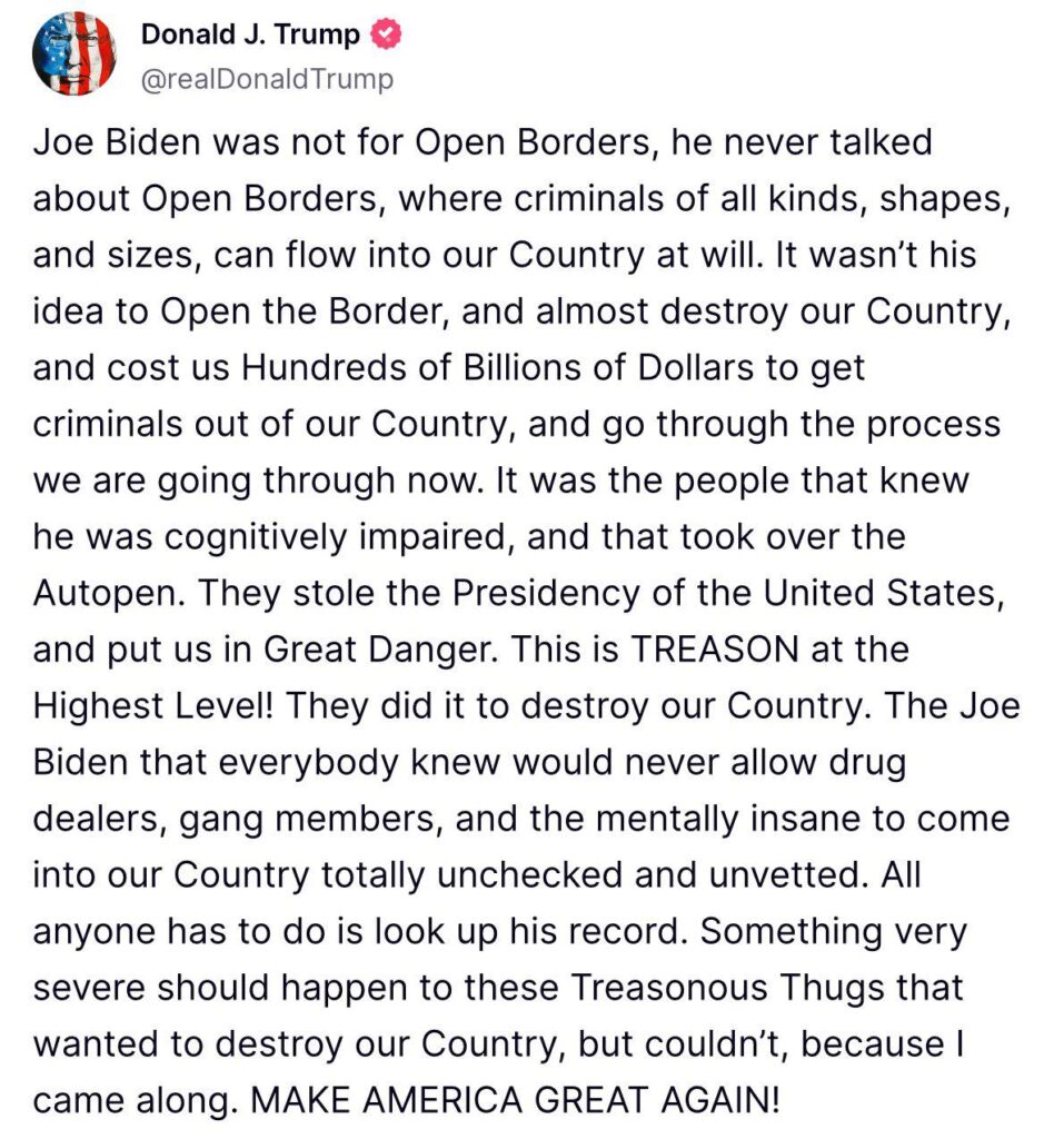 “It wasn’t his idea to open the border… It was the people that knew he was cognitively impaired, and that took over the autopen,” he added. “This is TREASON at the highest level!… Something very severe should happen to these treasonous thugs that wanted to destroy our Country, but couldn’t, because I came along.”