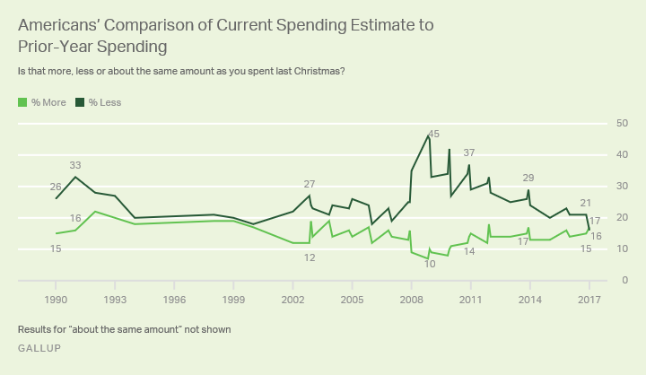 When asked to say how their expected spending compares with last year, a record-low 16% say they will spend less and 17% say they will spend more. As is typical, the largest share, now 65%, say their spending will be about the same. However, this is the first year since 2000 that roughly equal percentages plan to spend more vs. less. More often, a much higher proportion of consumers have said they plan to spend less rather than more.