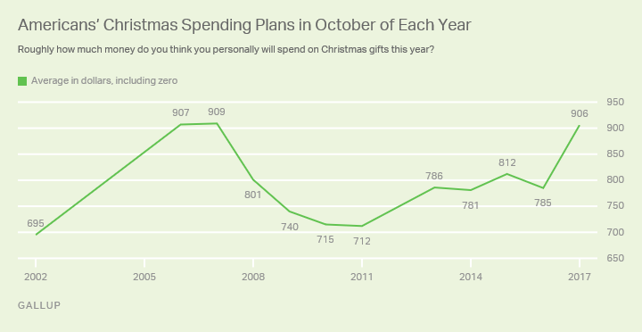 Gallup’s forecast of consumers’ 2017 Christmas shopping plans suggests retailers will see a sharp surge in sales, as Americans spend $906 on gifts – up from $785 in October 2016.
