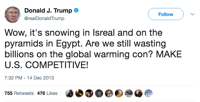 During his successful campaign, Trump mocked Obama’s placement of climate change in the context of national security. Here’s a sample of his approach from a campaign speech in Hilton Head, South Carolina, in late 2015: