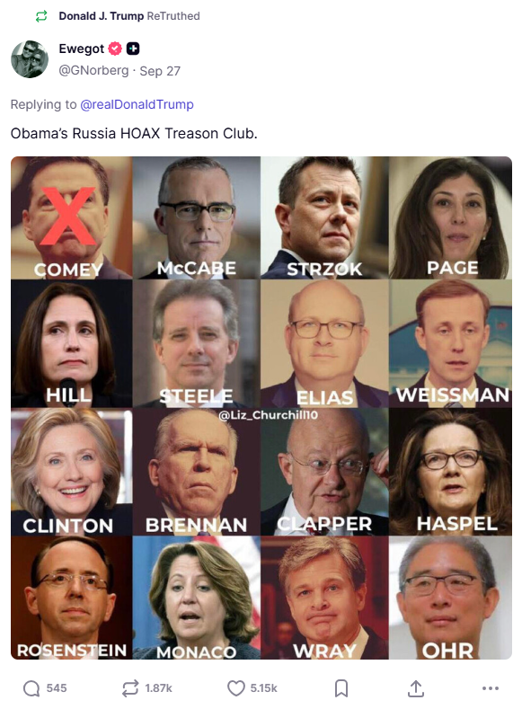 In addition to calling out Wray, President Trump shared an image of “Obama’s Russia HOAX Treason Club,” with an X over Comey’s face but fifteen other Deep State criminals waiting to be held accountable.