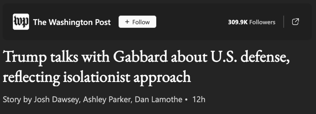 WaPo also lamented that Trump’s talks with Gabbard are just a facet of his overall foreign policy approach.
