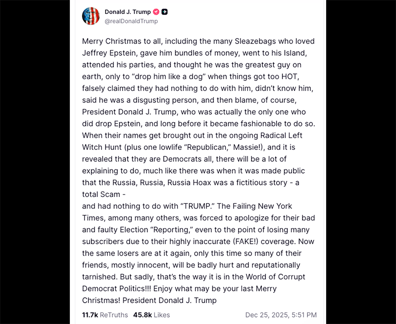 “Merry Christmas to all, including the many Sleazebags who loved Jeffrey Epstein, gave him bundles of money, went to his Island, attended his parties, and thought he was the greatest guy on earth, only to ‘drop him like a dog’ when things got too HOT, falsely claimed they had nothing to do with him, didn’t know him, said he was a disgusting person, and then blame, of course, President Donald J. Trump, who was actually the only one who did drop Epstein, and long before it became fashionable to do so,” the president fired off in a Christmas Day Truth Social post.