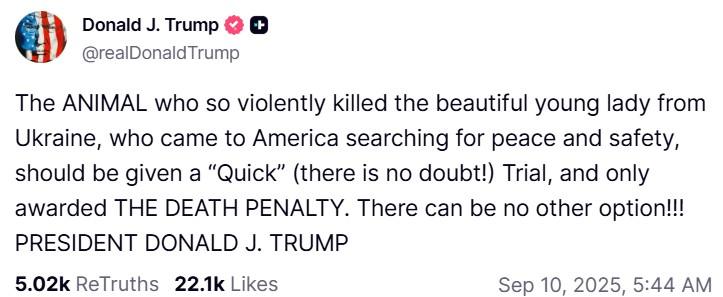 “The ANIMAL who so violently killed the beautiful young lady from Ukraine, who came to America searching for peace and safety, should be given a ‘Quick’ (there is no doubt!) Trial, and only awarded THE DEATH PENALTY.” He followed up without hesitation: “There can be no other option!”