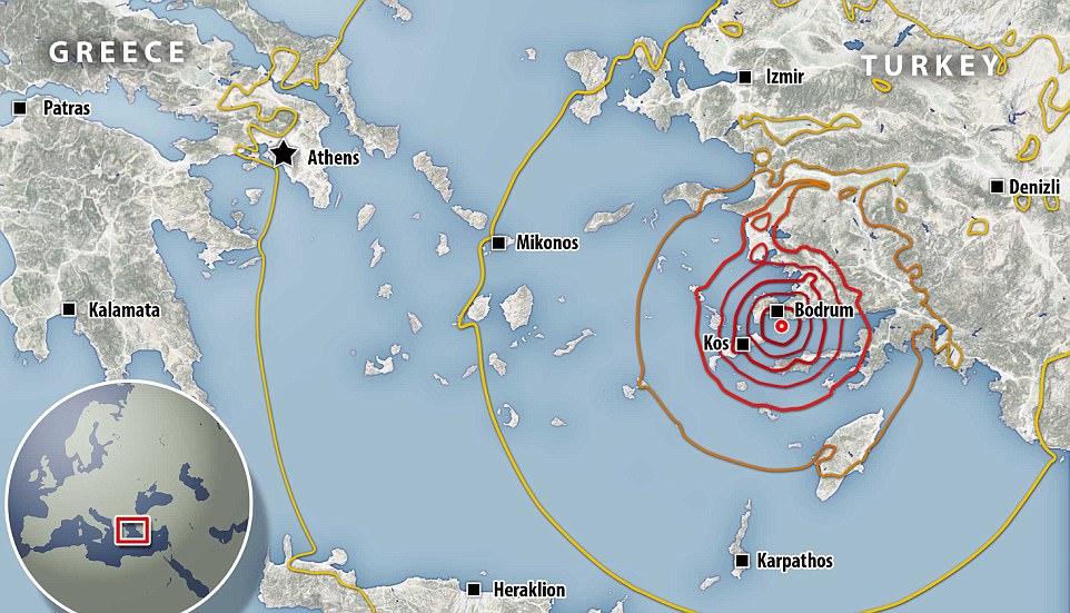 The epicentre of the magnitude-6.7 quake was off Bodrum, southwest Turkey, with the country’s Aegean coast and Greek holiday islands including Kos and Rhodes worst affected. Tens of thousands of tourists who were forced to sleep outdoors have now been warned of possible aftershocks.