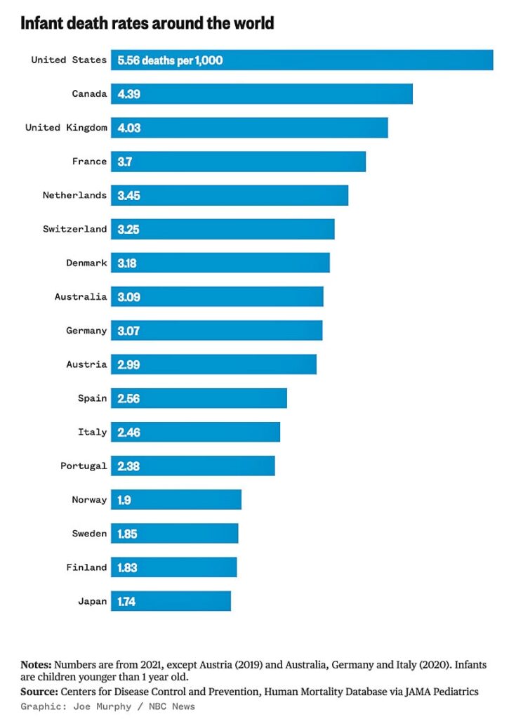 NBC News attributed the high infant mortality rate in the U.S. in part to its relatively high rate of sudden infant death syndrome or SIDS — which it defined as “the unforeseen and unexplained death of an infant younger than 1.”