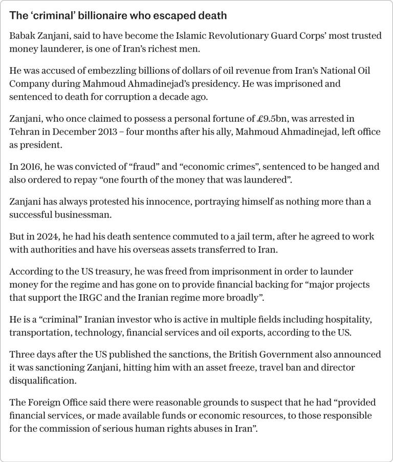 The Telegraph reports: Both companies are linked to Babak Zanjani, an Iranian billionaire who has been sanctioned by the British Government for his suspected role in raising money for those carrying out “serious human rights abuses” in Iran.