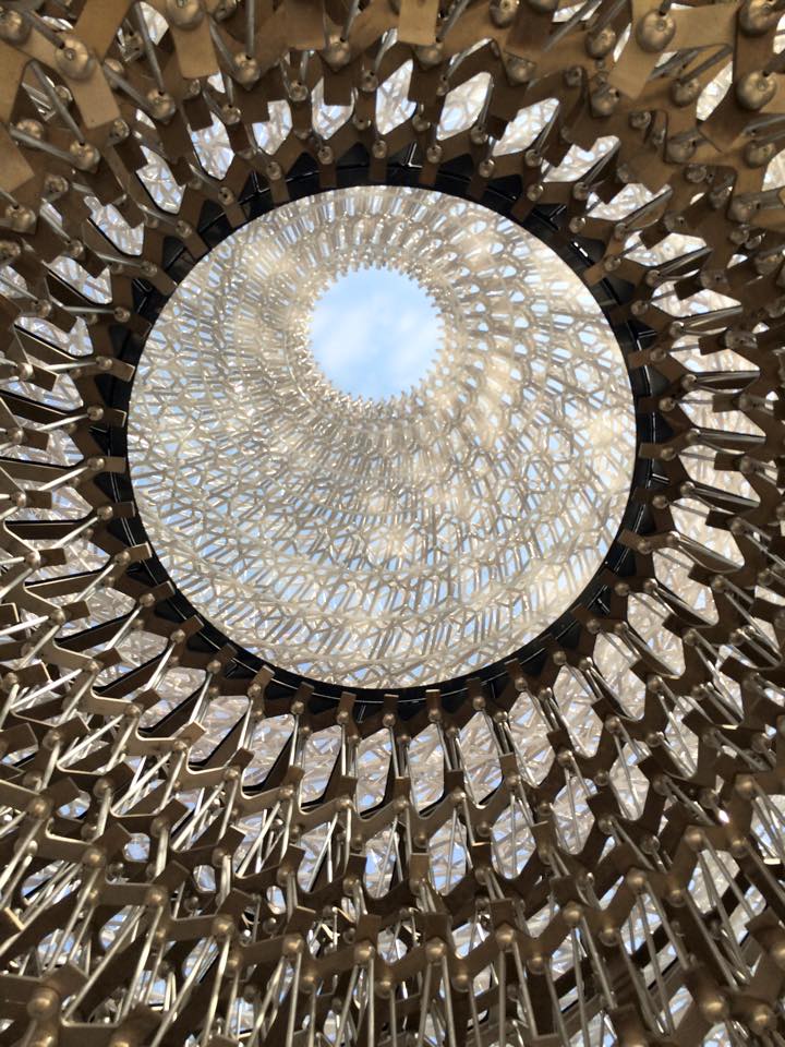 The UK Pavilion which received 20,000 visitors on its opening weekend sports a 25 ton metal honeycomb hive on its roof which is connected to a real hive back in the UK. As activity in the UK hive ebbs and flows the sounds are relayed to the Pavilion via a 100 channel sound system and LED coloured lights glow in unison with the 150,ooo piece aluminium hive.