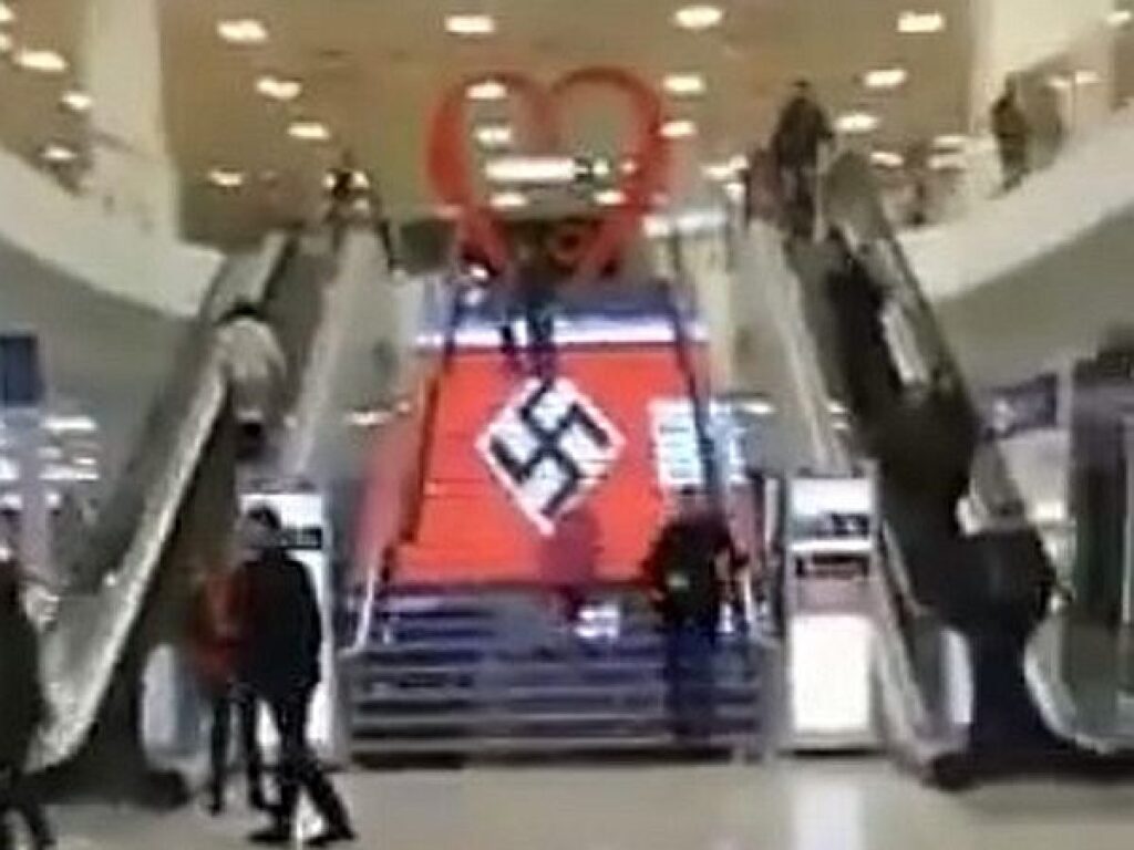Images and video of a giant swastika on display at a shopping mall in Ukraine that is located on a street named after a notorious Nazi collaborator have surfaced on social media.