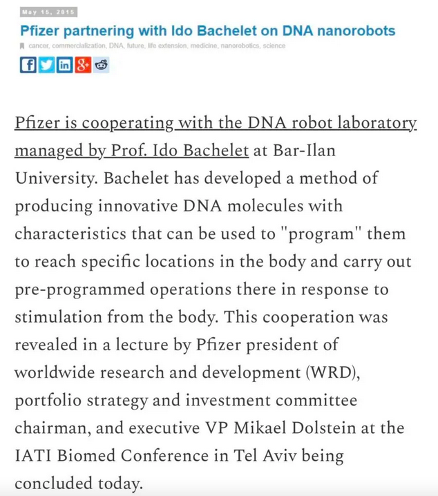 A deep dive into Pfizer’s murky history reveals they partnered with an Israeli research university to develop programmable nanorobots to be injected into people to alter their DNA, issue them with an IP address, and connect them to the internet.
