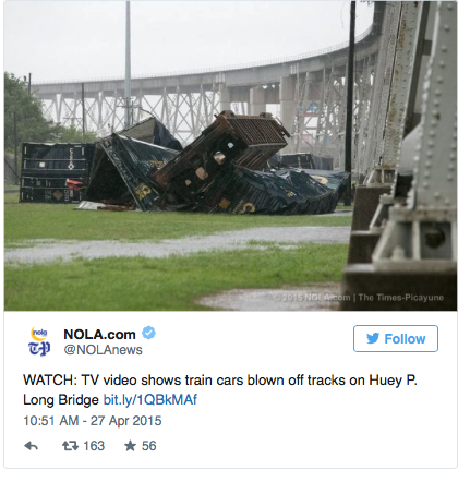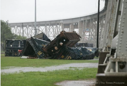 On the Huey P. Long bridge, just a few miles from the bustling New Orleans French Quarter and downtown area, the bridge was experiencing such horrific winds that it was blown off the tracks, crashing to the ground.