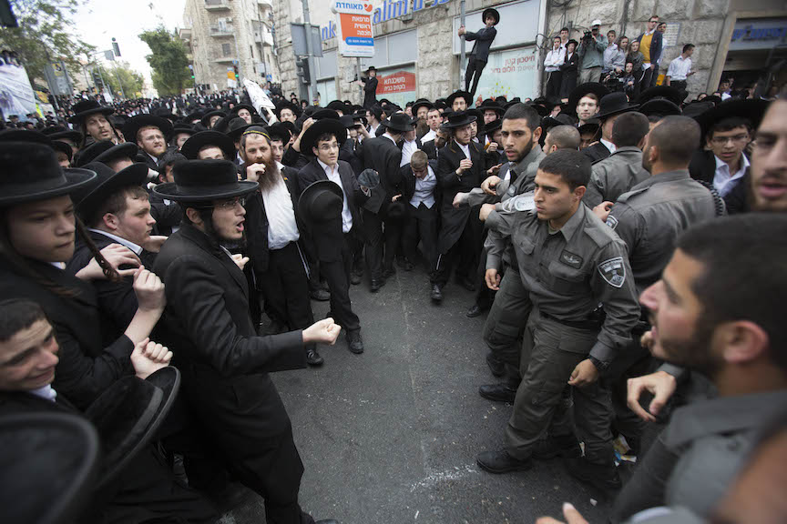Nine ultra-Orthodox Jews were arrested following violent clashes with security forces in Jerusalem during protests against conscription into the armed forces.