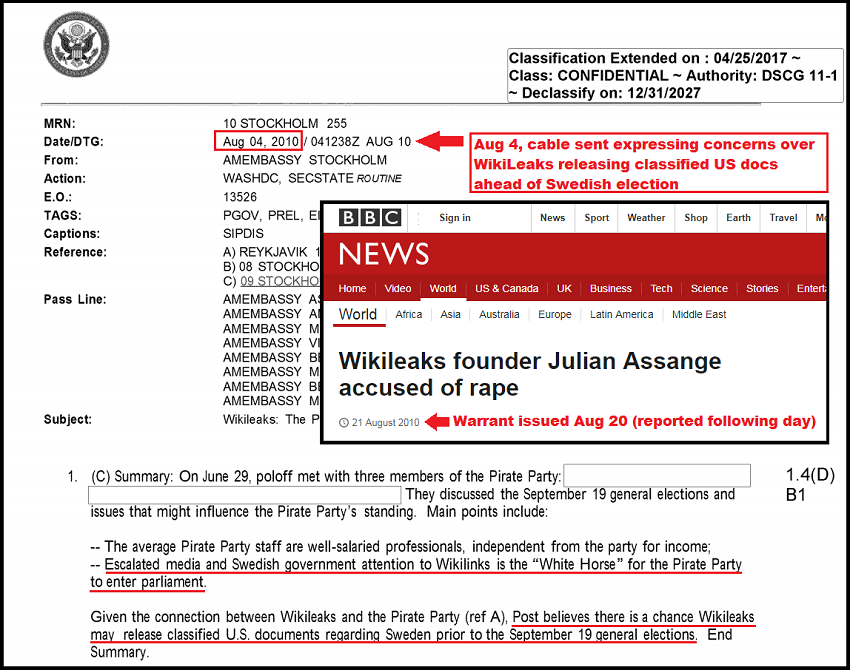 Two weeks after the cable was sent, an arrest warrant was issued for WikiLeaks founder Julian Assange on sexual assault allegations – which was dropped, then re-issued, then revoked again by Swedish authorities in August 2015 when they dropped their case against him.
