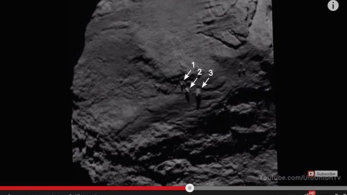 Scientists are baffled by three boulders that appear to balance perfectly on Comet 67P, as seen in the images on the video below which were taken by the European Space Agency’s Rosetta Spacecraft.