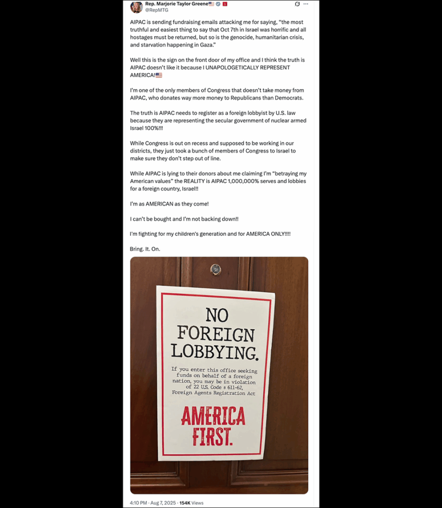 “AIPAC is sending fundraising emails attacking me for saying, ‘the most truthful and easiest thing to say that Oct 7th in Israel was horrific and all hostages must be returned, but so is the genocide, humanitarian crisis, and starvation happening in Gaza,’” Rep. MTG wrote.