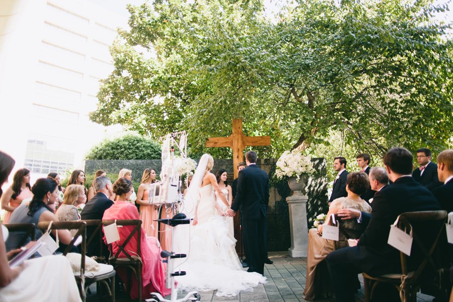 Then, 75 friends and family members gathered in the hospital’s garden for the ceremony. Photographer Jess Barfield, who captured the beautiful images of CC and Conner’s day, said of the event, “I’ll never forget the moment CC and her dad were ushered through M.D. Anderson and patients clapped and cheered all the way to the ceremony. The joy was contagious; the day was sacred.”